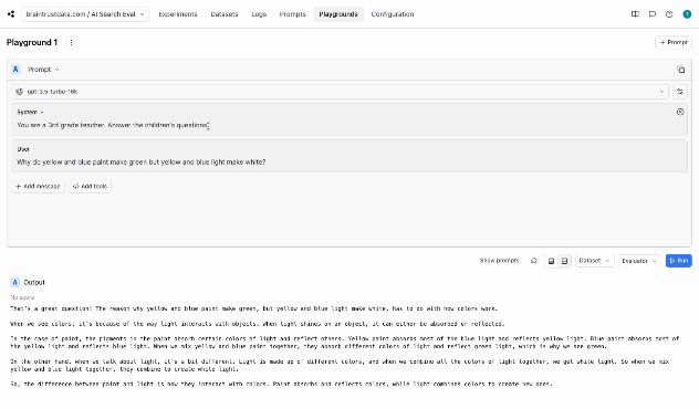 Braintrust supports this through our Playgrounds, which are built for rapid iteration. You can test prompts, tweak them, try out different models, and even access test inputs from your datasets.