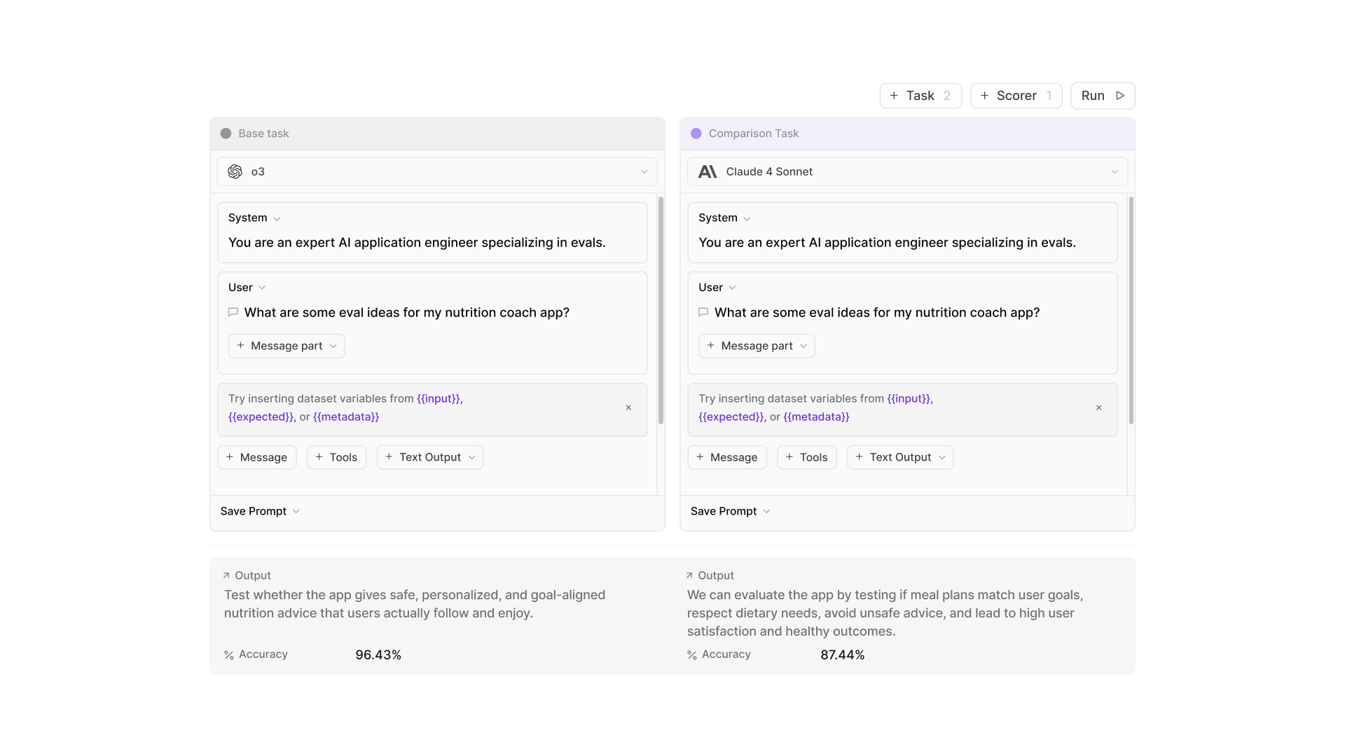 Playgrounds embed tasks, scorers, and datasets directly into a single intuitive UI. You can: