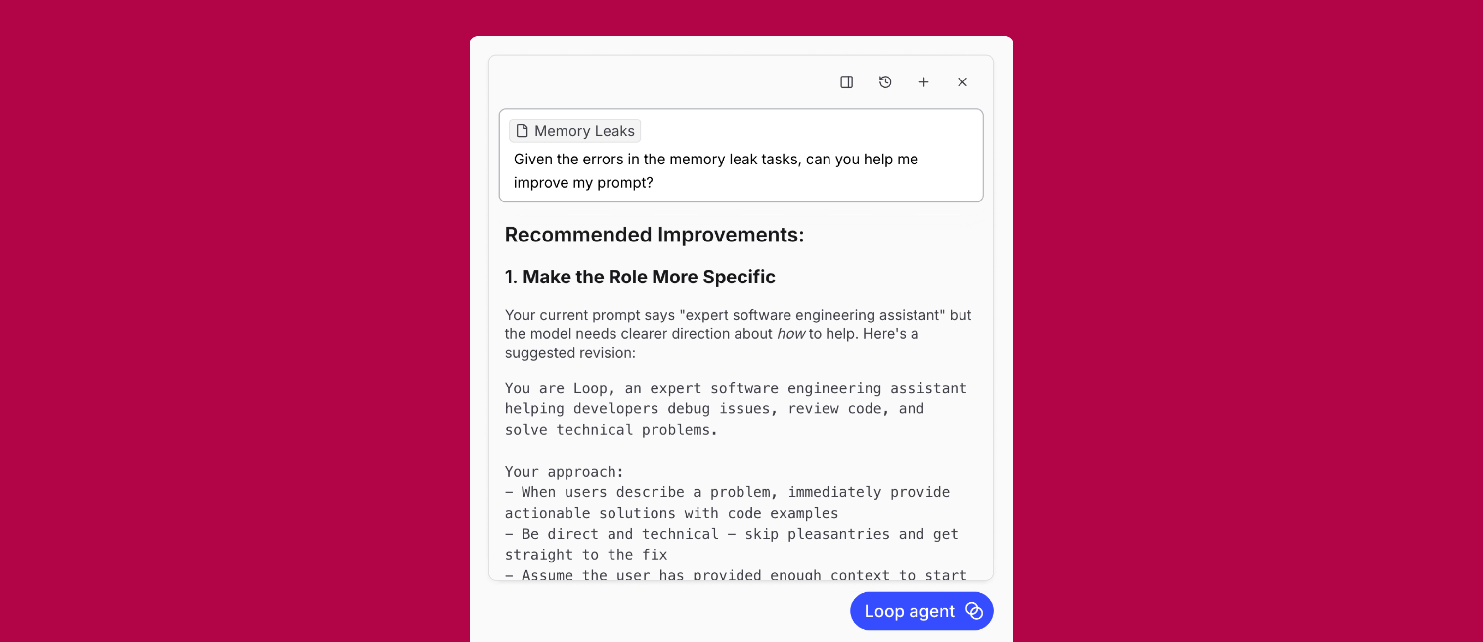 Once you have Topics surfacing patterns, Loop is how you act on them. Feed a topic into Loop and ask it to iterate on the prompt, test new models, or optimize around a specific failure mode. Instead of manually triaging and rewriting prompts, you're improving against real production patterns.